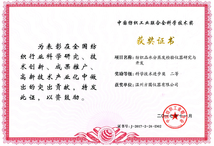 近日,在由中國紡織工業(yè)聯(lián)合會主辦、紡織之光科技教育基金會協(xié)辦的“紡織之光”2017年度中國紡織工業(yè)聯(lián)合會科技教育獎勵大會上,溫州方圓儀器有限公司參評的“紡織品水分蒸發(fā)檢驗儀器研究與開發(fā)”、“高導熱化纖長絲及其新型涼感織物生產關鍵技術”雙雙榮獲“科學技術進步獎二等獎”。